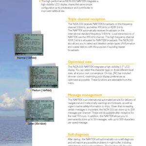 Permanent storage of data settings NCR-333 can set and store the message type and seashore station that receive to internal memory. The data, therefore, does not need to be re-set, even after power has been turned off.